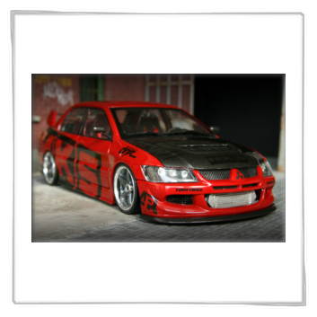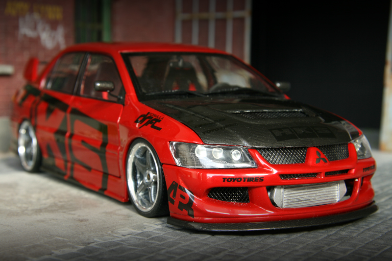 Base: Mitsubishi Lancer EVO IX 1/18Modifications:- Carbon front lip- Carbon hood- Carbon wing- Carbon trunk- Aluminium exhaust- Engine preparation- Recaro seats- Volk wheels- Carbon diffusor- F1 carbon mirrors